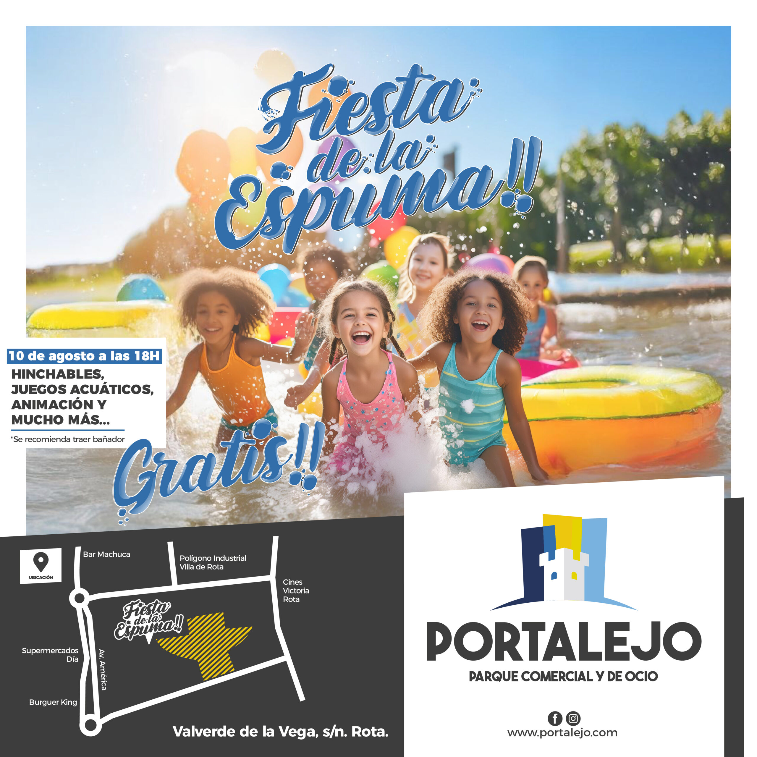 Don't miss this opportunity to enjoy an afternoon full of laughter, games and lots of aquatic fun with your loved ones in Portalejo on Saturday 10 August from 18:00H and celebrate summer with us. We will wait for you!