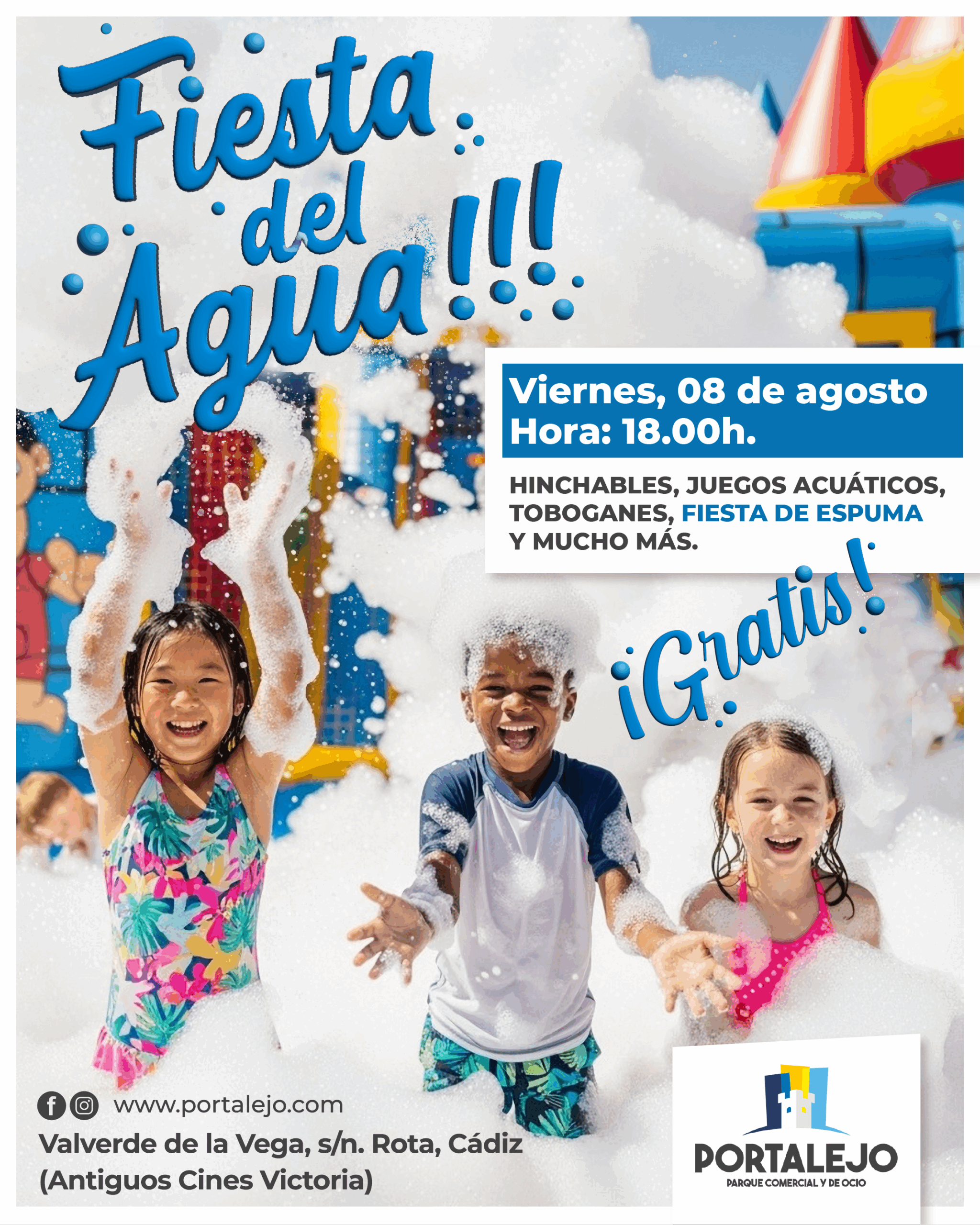 Este evento es una oportunidad perfecta para disfrutar de un día diferente, en un ambiente familiar y seguro, con actividades para todos los gustos. further, la Fiesta del Agua de Portalejo se celebrará en una buena ubicación, ya que es una plaza segura, sin coches ni carreteras cercanas y con establecimientos para cenar y tomar algo, disponibles en el CC Portalejo, a tu disposición. Dicha ubicación se encuentra en la plaza peatonal entre los antiguos cines victoria y Burger King de Portalejo Rota.